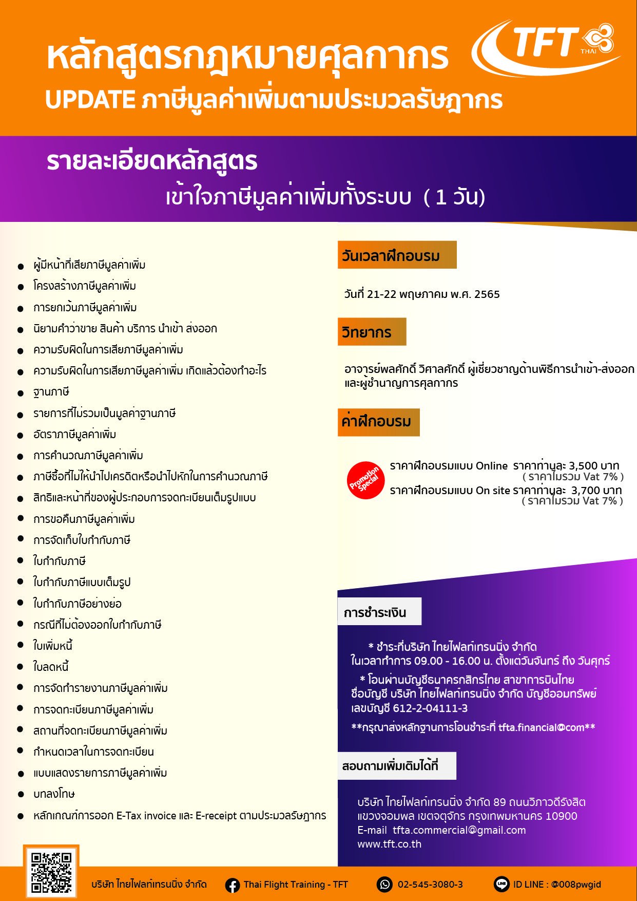 บริษัท ไทยไฟลท์เทรนนิ่ง จำกัด ได้เปิดคลาสการเรียนหลักสูตรศุลกากร และ Update ภาษีมูลค่าเพิ่มตามประมวลรัษฎากร หลักสูตรศุลากากรโดยอาจารย์วันชัย เรืองฉิม ผู้เชี่ยวชาญด้านพิธีการนำเข้า-ส่งออกเป็นวิทยากรผู้บรรยาย และ Update ภาษีมูลค่าเพิ่มตามประมวลรัษฎากรโดยอาจารย์พลศักดิ์ วิศาลศักดิ์ ผู้เชี่ยวชาญด้านภาษีอากรเป็นวิทยากรผู้บรรยาย ซึ่งจัดการบรรยายขึ้นทั้งรูปแบบ Online และ On site ณ วันที่ 21-22 พฤษภาคม 2565 ที่ บริษัท ไทยไฟล์ทเทรนนิ่ง จำกัด การบินไทย สำนักงานใหญ่ วิภาวดี